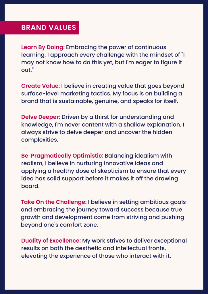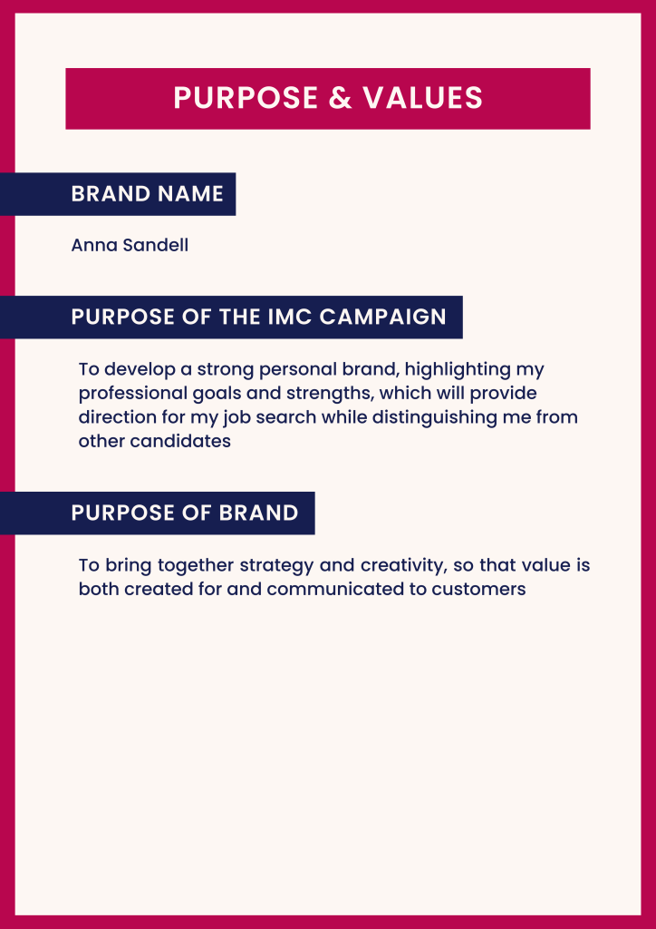 I created this personal brand in my Integrated Marketing Communications class to highlight my professional strengths and give direction to my job search while distinguishing myself from other candidates.